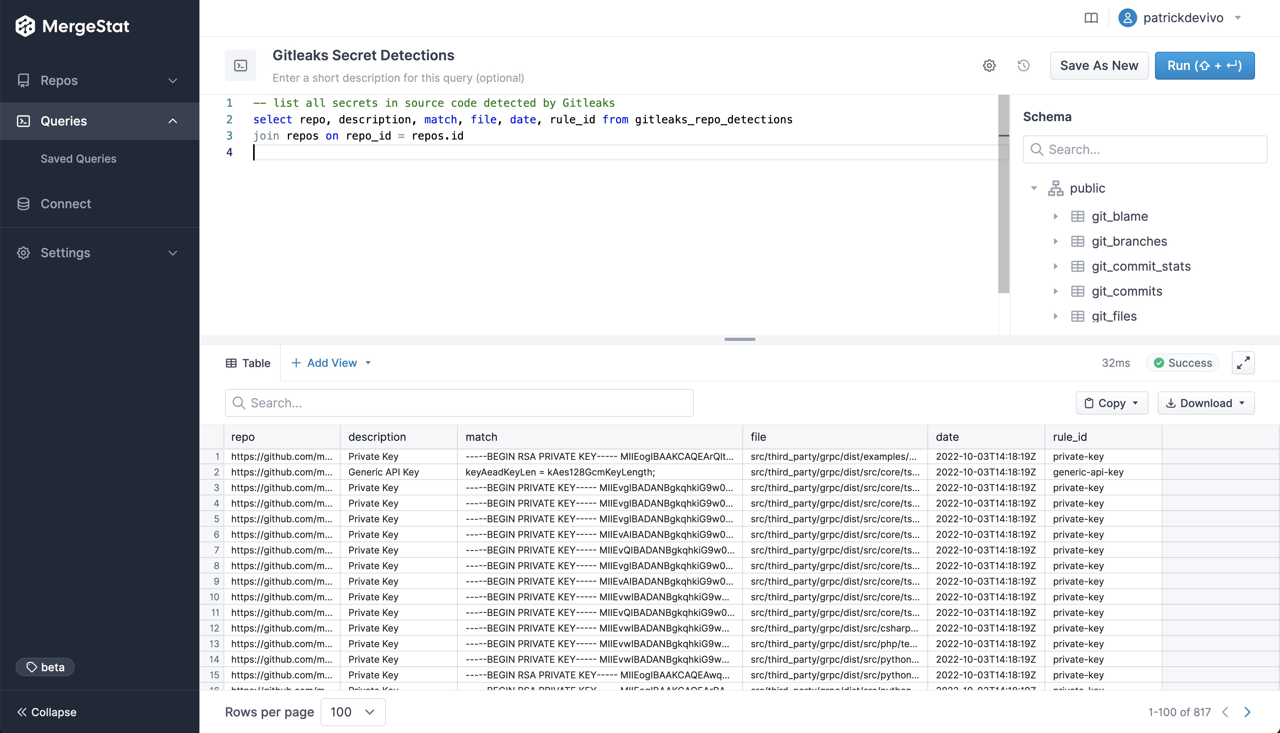 These tools, in conjunction with MergeStat, allow users to report on and aggregate leaked secrets across many repos in an organization.